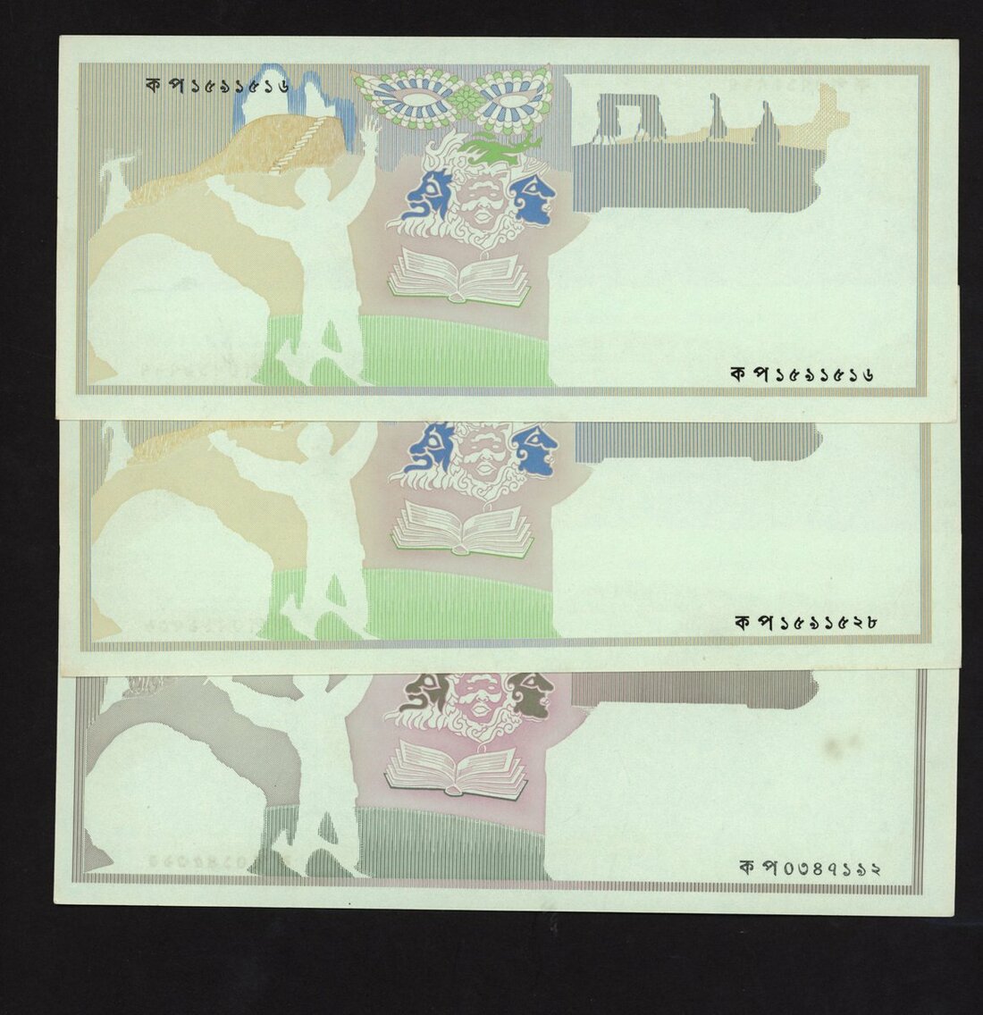 (x) Test notes (3), similar designs with 2 different colour schemes, theatre themed,