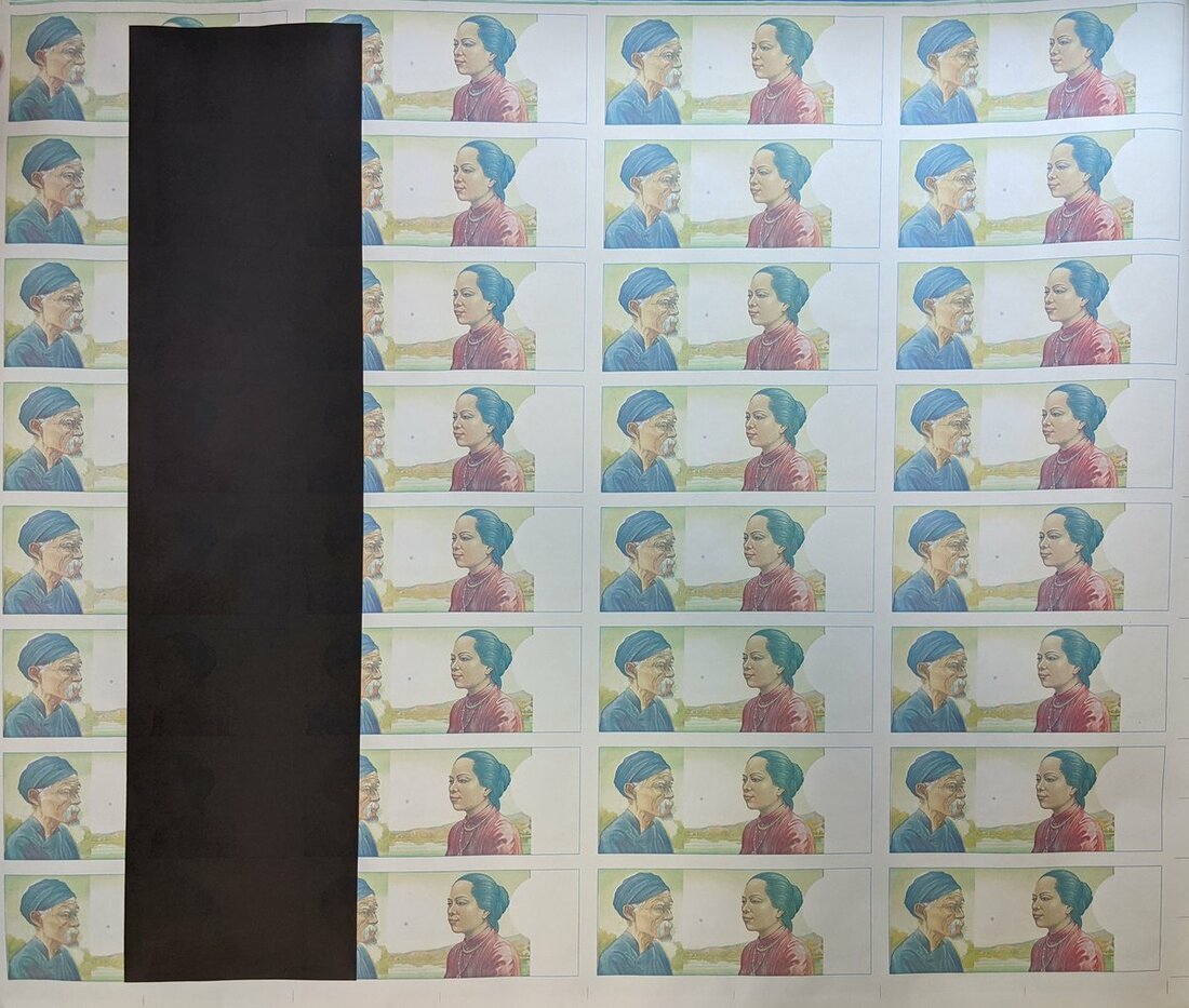(x) De La Rue Giori S.A., a sheet of 32 test note, William Shakespare at right, old man and young woman design from South Vietnam 1000 dong at reverse, a black bar covering part of the design