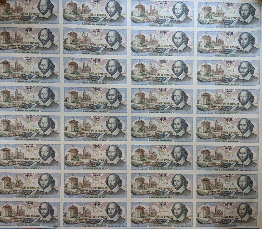 (x) De La Rue Giori S.A., a sheet of 32 test note, William Shakespare at right, old man and young woman design from South Vietnam 1000 dong at reverse, a black bar covering part of the design
