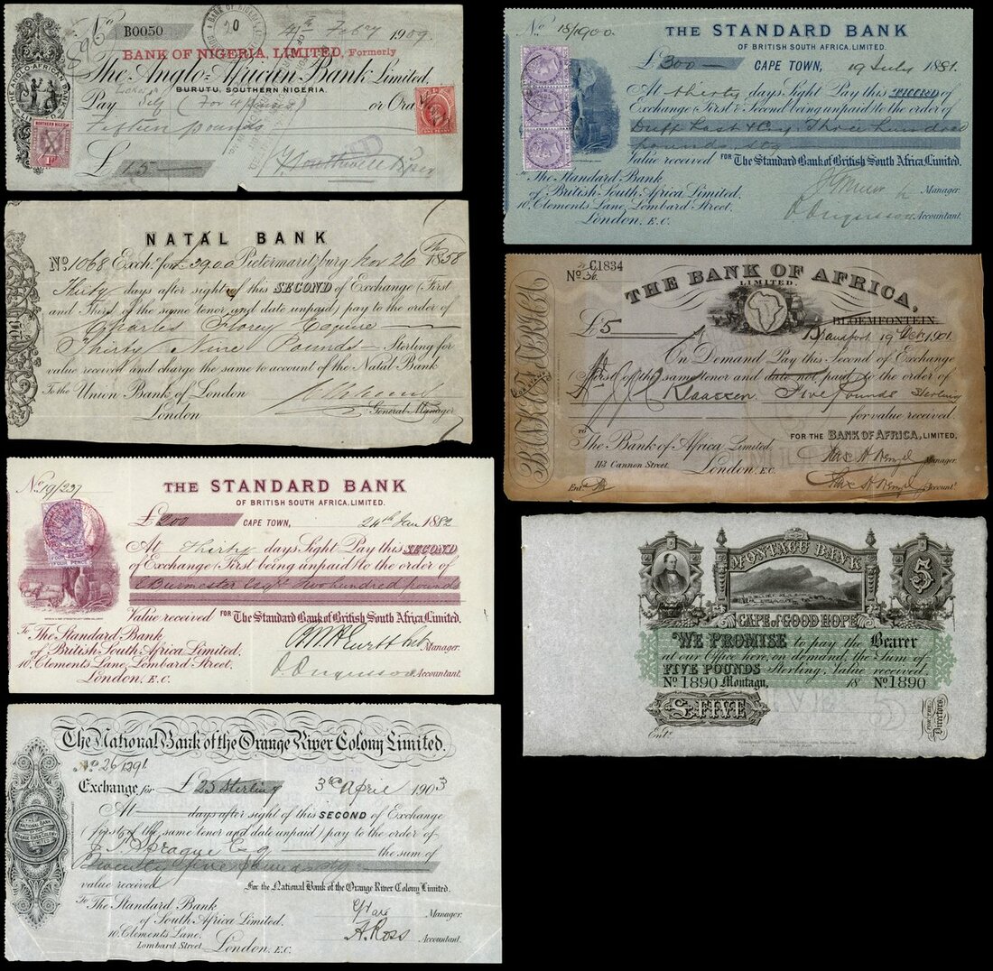 (x) A group of South African cheques, including Bank of Africa, Bank of Nigeria, Natal Bank, National Bank of the Orange River Colony, Standard Bank of South Africa, also a remainder Montagu Bank,