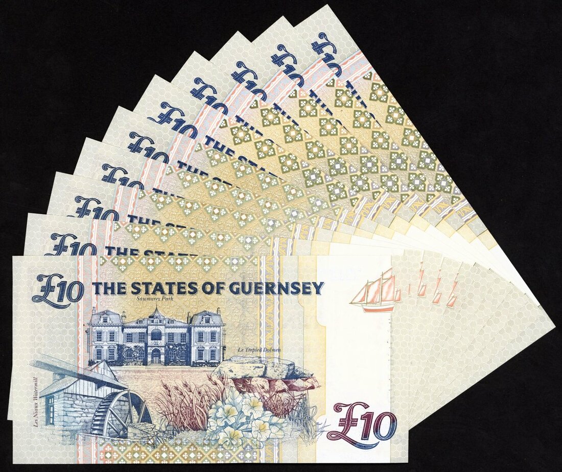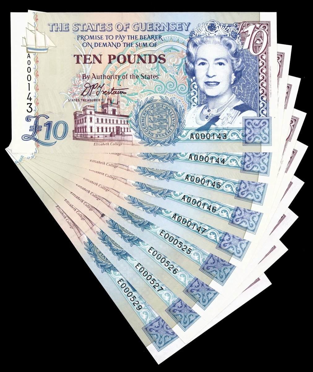 (x) States of Guernsey, consecutive £10 (5), ND (1995), serial numbers A000143/44/45/46/47, also consecutive £10 (5), serial numbers E000525/26/27/28/29, signature Trestain and Clark respectively,