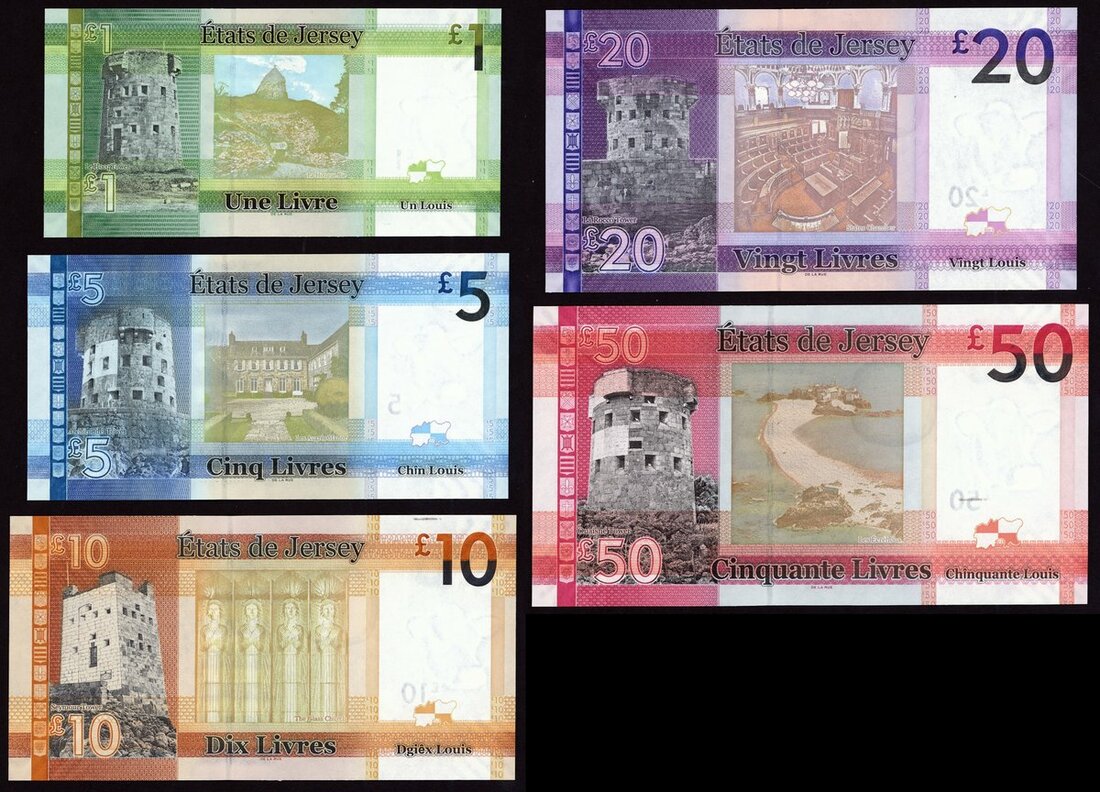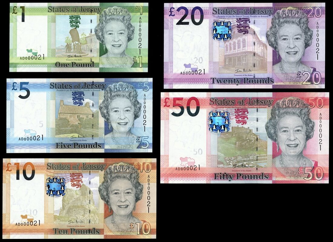 (x) States of Jersey, a set of the 2010 issues with matching serial number 21, including £1, £5, £10, £20 and £50, prefix AD, (Pick 32-36, TBB B127-B131), first prefix matching number set, uncirculated (5 notes)