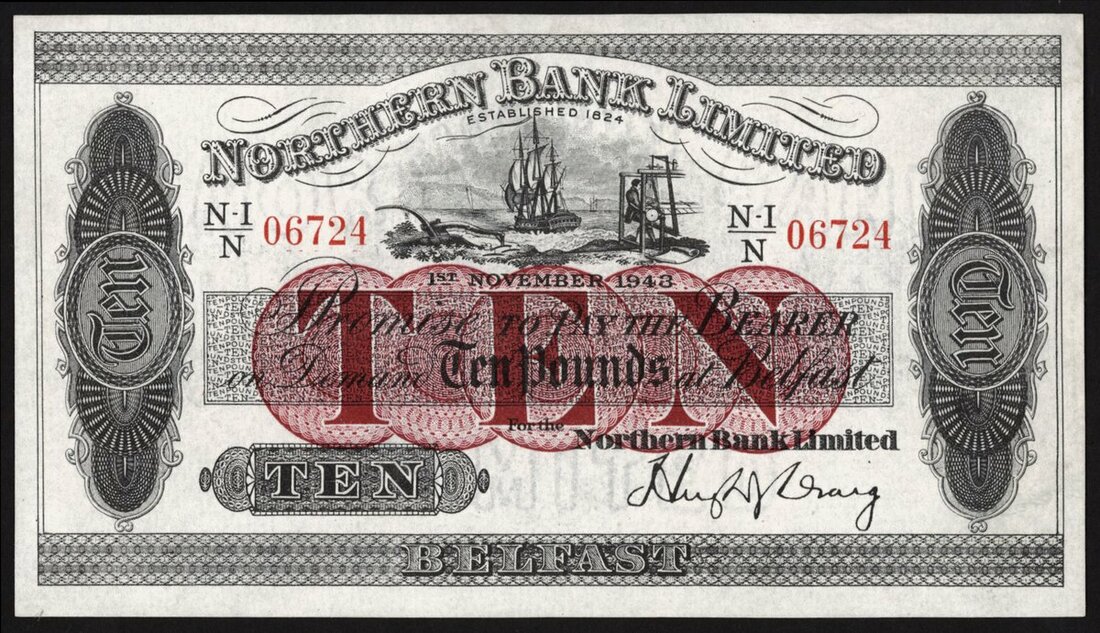 Northern Bank Limited, Northern Ireland, £10, 1 November 1943, serial number N/I/N 06724, black and white, value in red guilloche at centre, signature Craig,