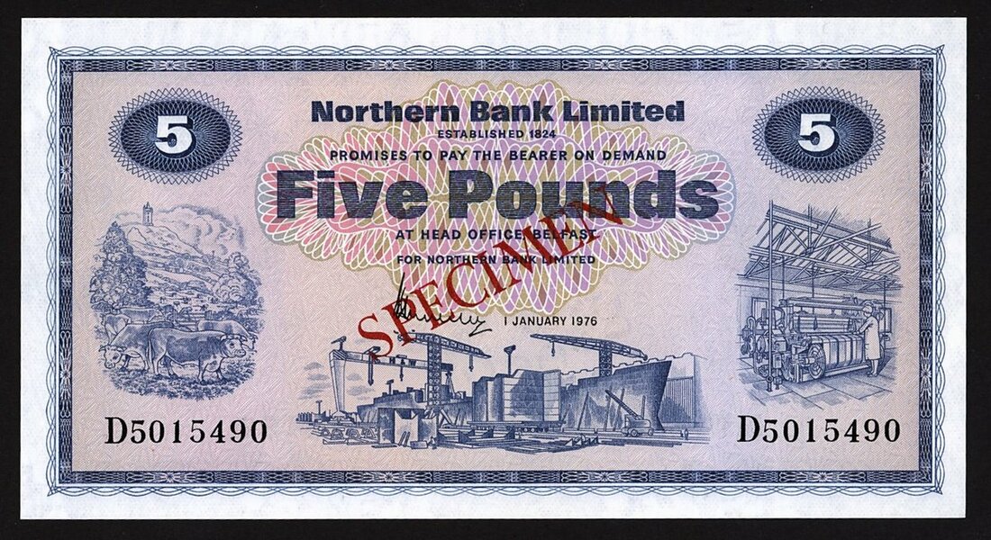 Northern Bank Limited, Northern Ireland, specimen £5, 1 January 1976, serial number D5015490, (PMI NR92s, Pick 188cs), uncirculated