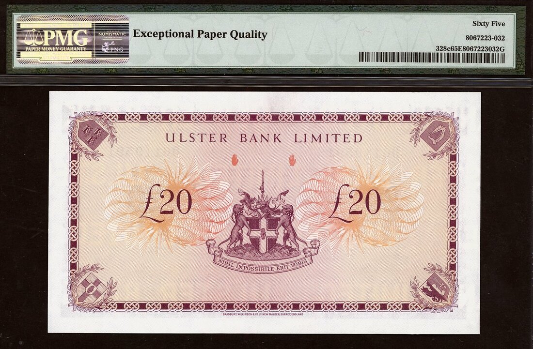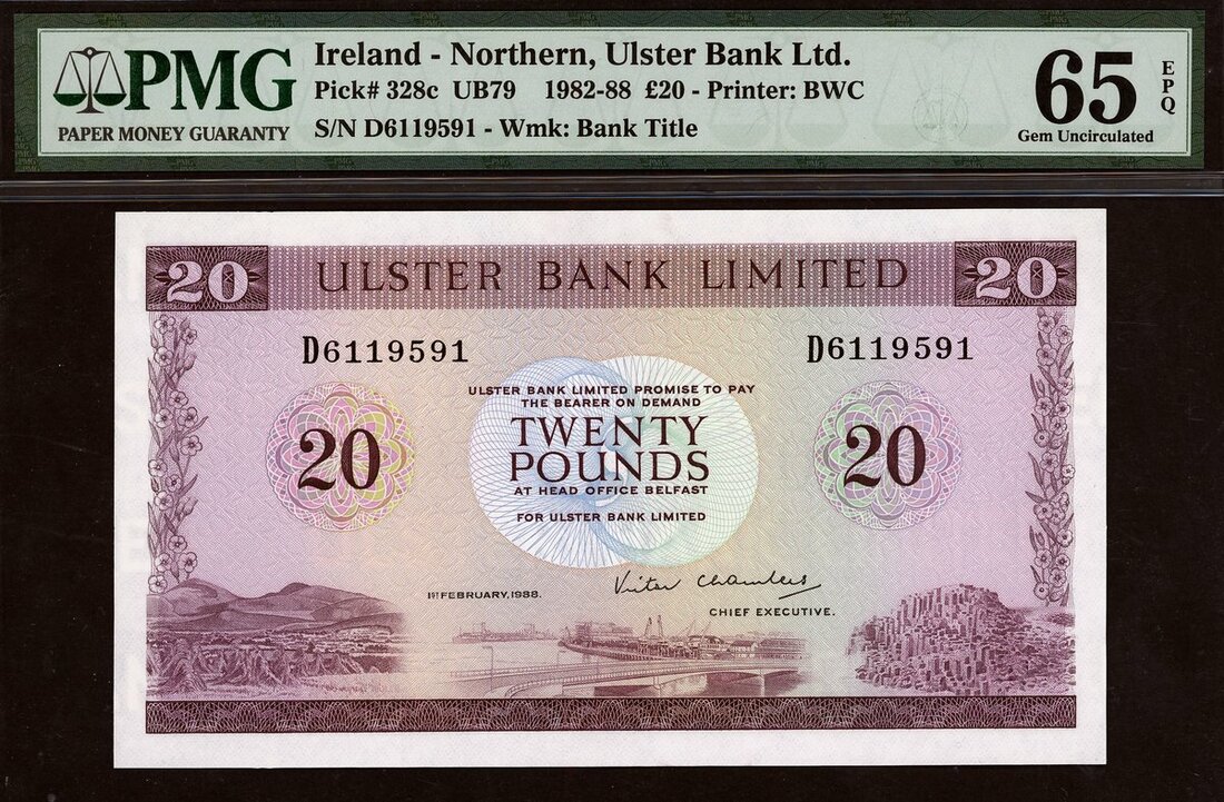 (x) Ulster Bank Limited, Northern Ireland, £20, 1 February 1988, serial number D6119591, (PMS UB79, Pick 328c), last prefix and date for issue, in PMG holder 65 EPQ Gem Uncirculated