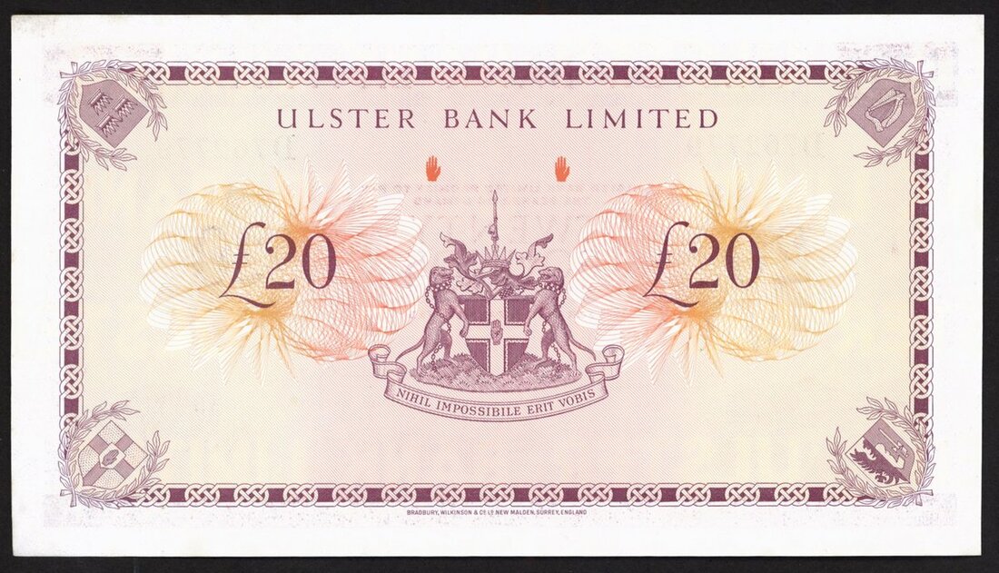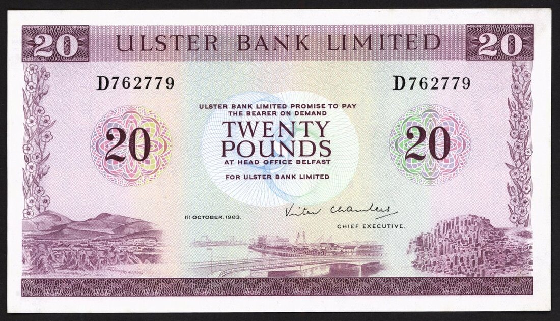 (x) Ulster Bank Limited, Northern Ireland, £20, 1 October 1983, serial number D762779, (PMI UB79, Pick 328c), about uncirculated