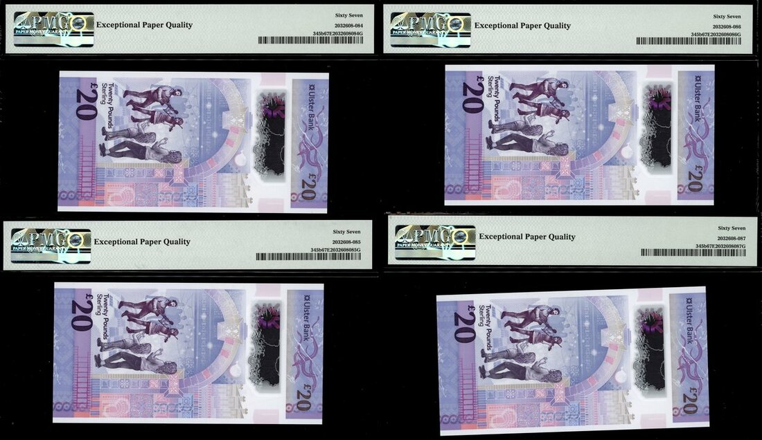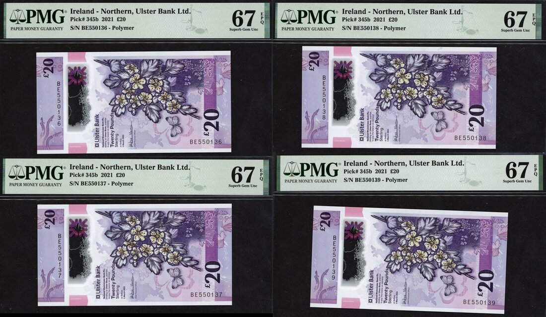 (x) Ulster Bank Limited, Northern Ireland, consecutive £20 (4), 2021, prefix BE, (Pick 345b), all in PMG holders 67 EPQ Superb Gem Unc (4 notes)