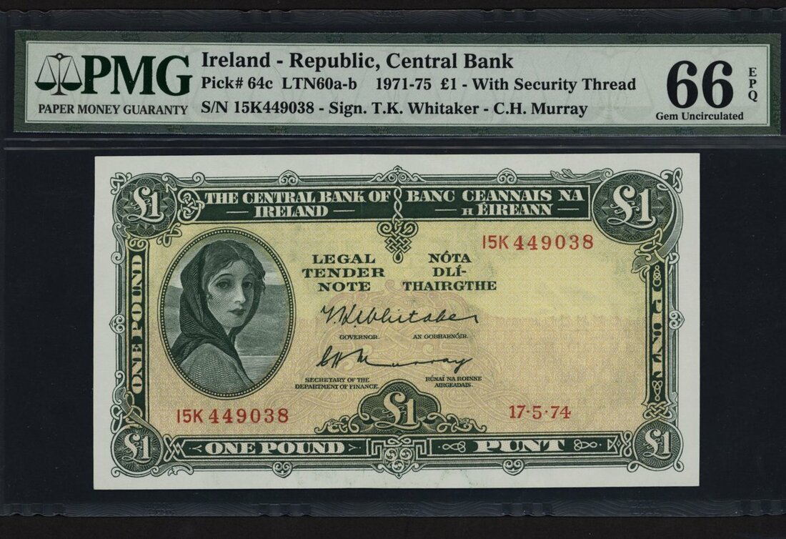 (x) Ireland, £1, 1971-75, serial number 15K449038, (Pick 64c), in PMG holder 66 EPQ Gem Uncirculated