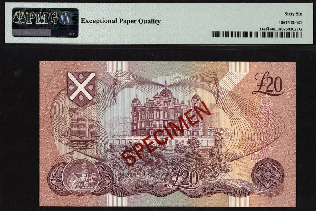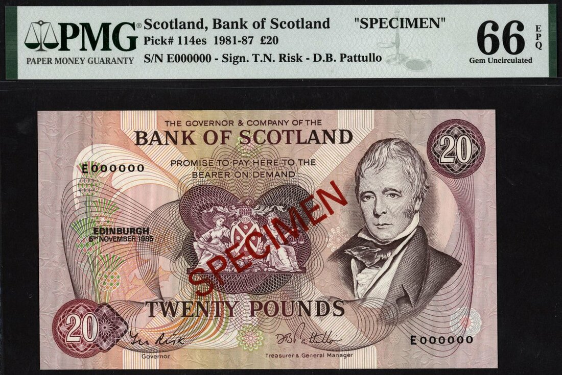 (x) Bank of Scotland, specimen £20, 6 January 1987, prefix F, (PMS BA118es, Pick 114es), in PMG holder 66 EPQ Gem Uncirculated