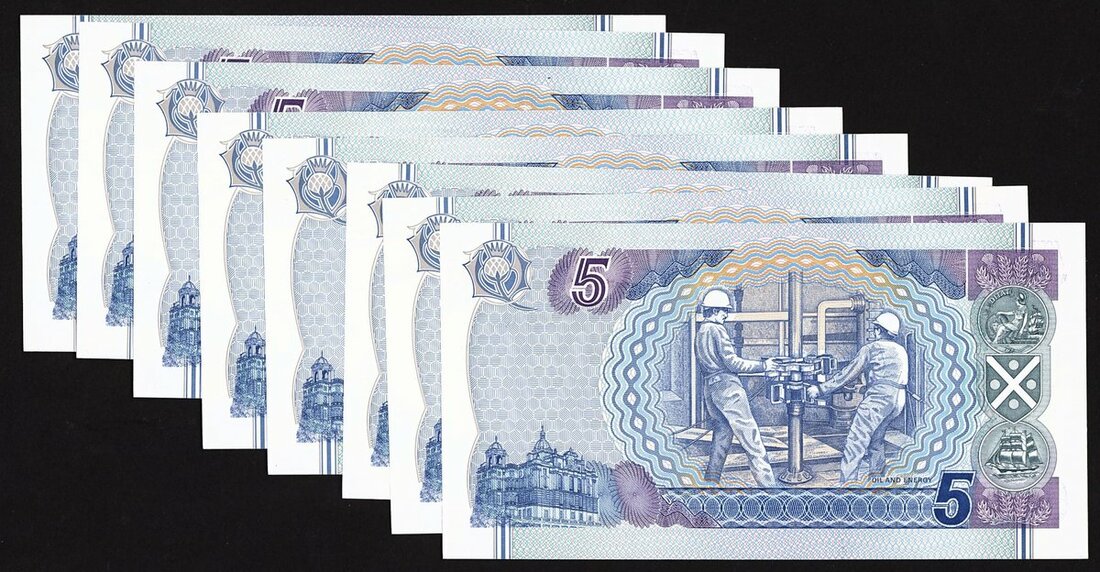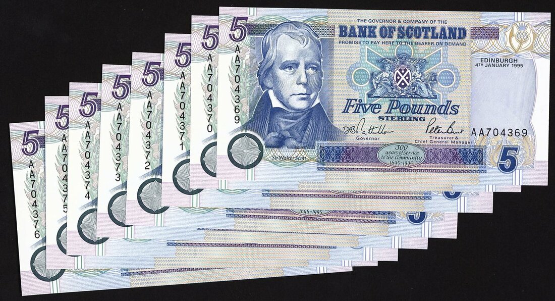 Bank of Scotland, consecutive run of £5 (8), 1995, prefix AA, (PMS BA122a), first run, uncirculated (8 notes)