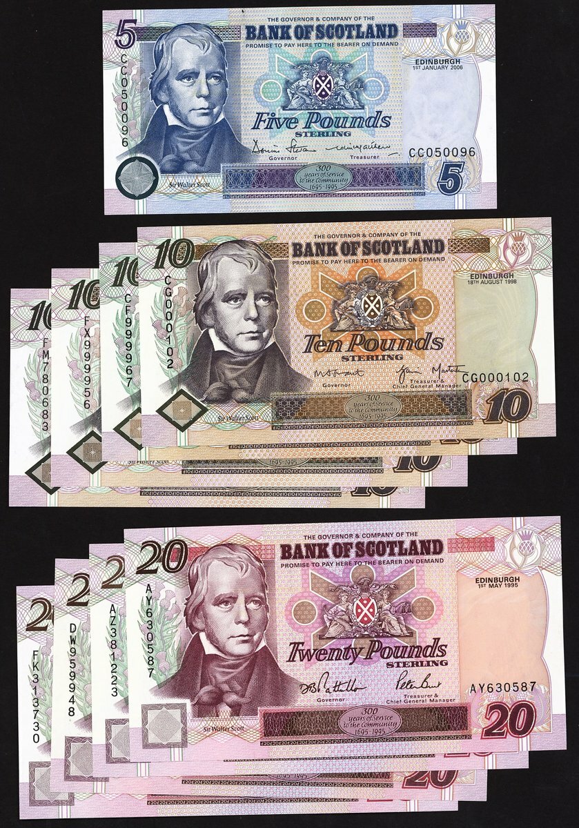 Bank of Scotland, including £5 2006, £10 (4) 1997 1998 2004 2006, £20 (4) 1995 1996 2003 2004,