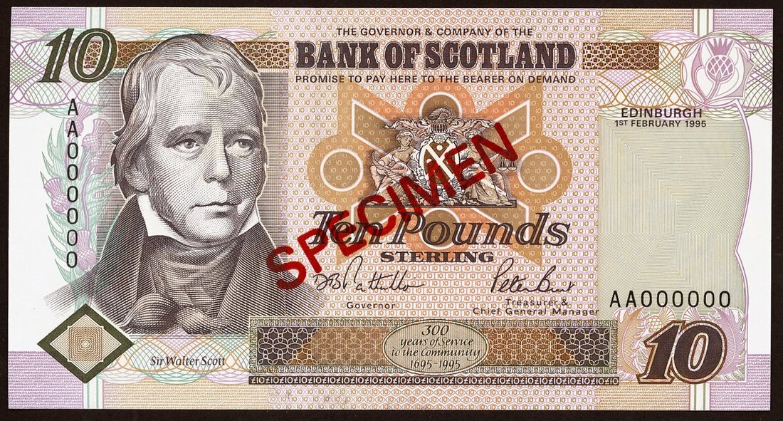 (x) Bank of Scotland, specimen £10, 1 February 1995, prefix AA, (PMS BA123as), counting flick at right, otherwise uncirculated