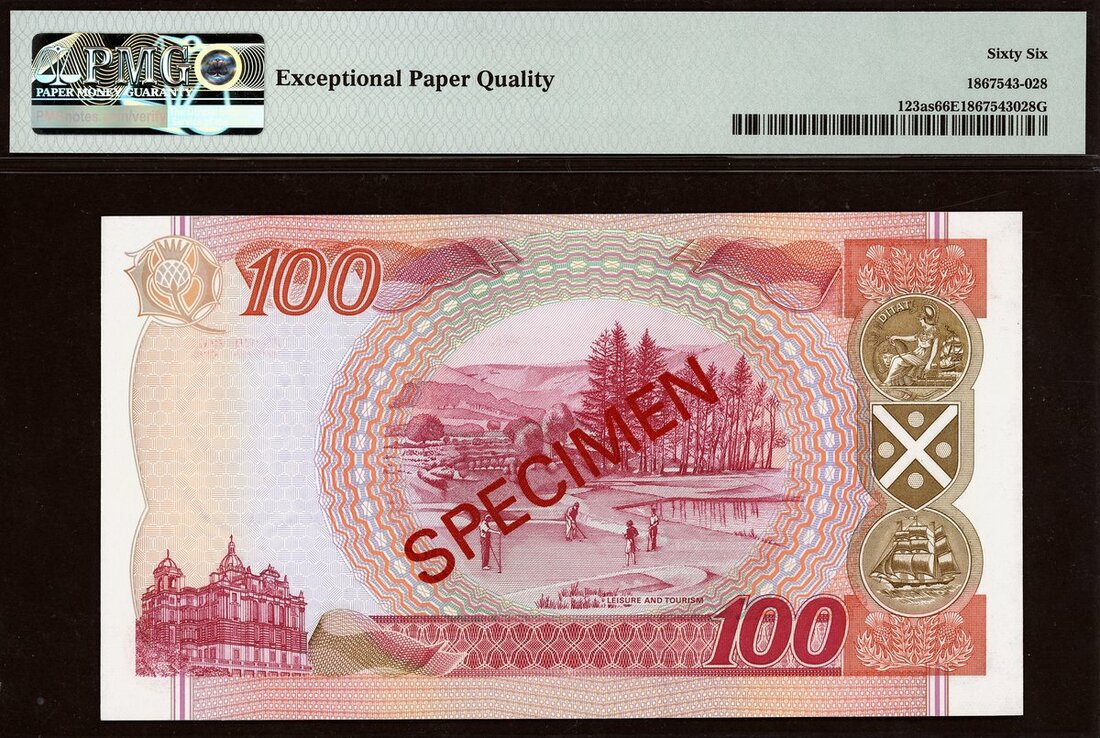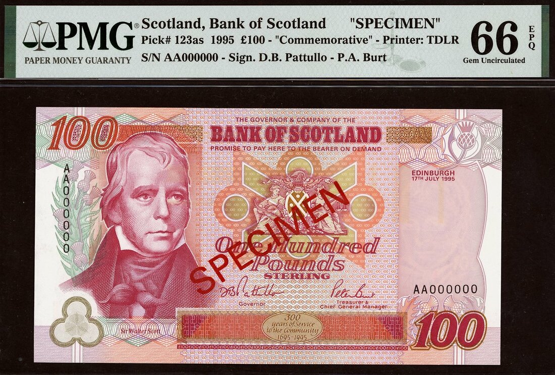 (x) Bank of Scotland, specimen £100, 17 July 1995, prefix AA, (PMS BA126as, Pick 123as), in PMG holder 66 EPQ Gem Uncirculated