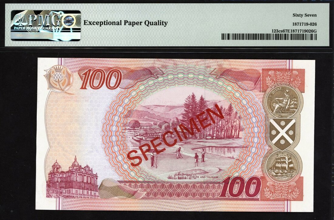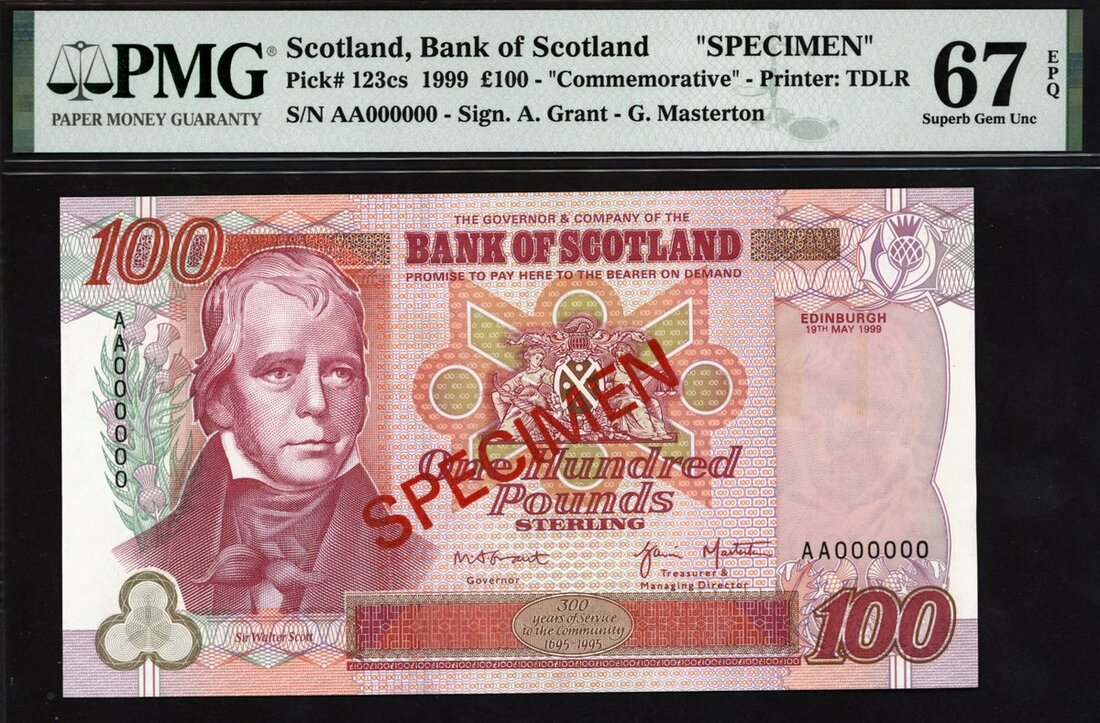 Bank of Scotland, specimen £100, 19 May 1999, zero serial numbers, (PMS BA126s, Pick 123cs), in PMG holder 67 EPQ Superb Gem Unc, scarce date