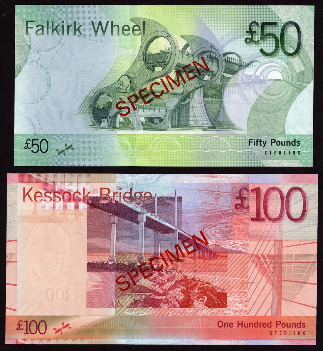 (x) Bank of Scotland, specimen £50 and £100, 17 September 2007, serial numbers AA000000, (PMS BA130as, BA131as, Pick 127as, 128as), Please note this type with red SPECIMEN overprints are NOT cut from a sheet previously sold in BoS charity at Spink, uncirculated (2 notes)