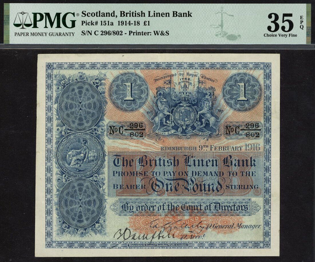 (x) British Linen Bank, £1, 9 February 1916, serial number C 296/802, (PMS BL60, Pick 151a), in PMG holder 35 EPQ Choice Very Fine, scarce in this grade