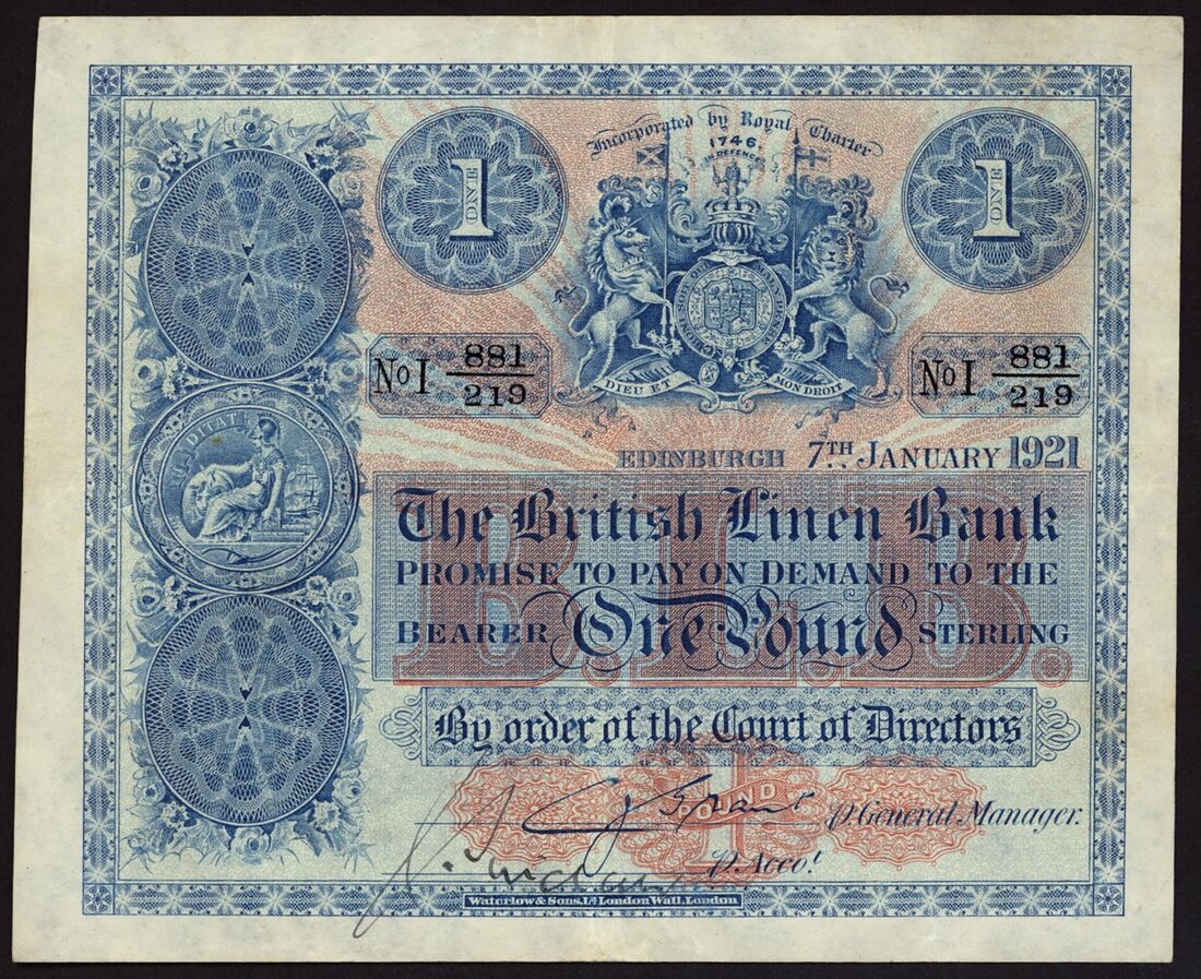 British Linen Bank, £1, 7 January 2921. serial number I 881/219, (PMS BL59b), centre crease with paper crinkle, very fine, quite scarce