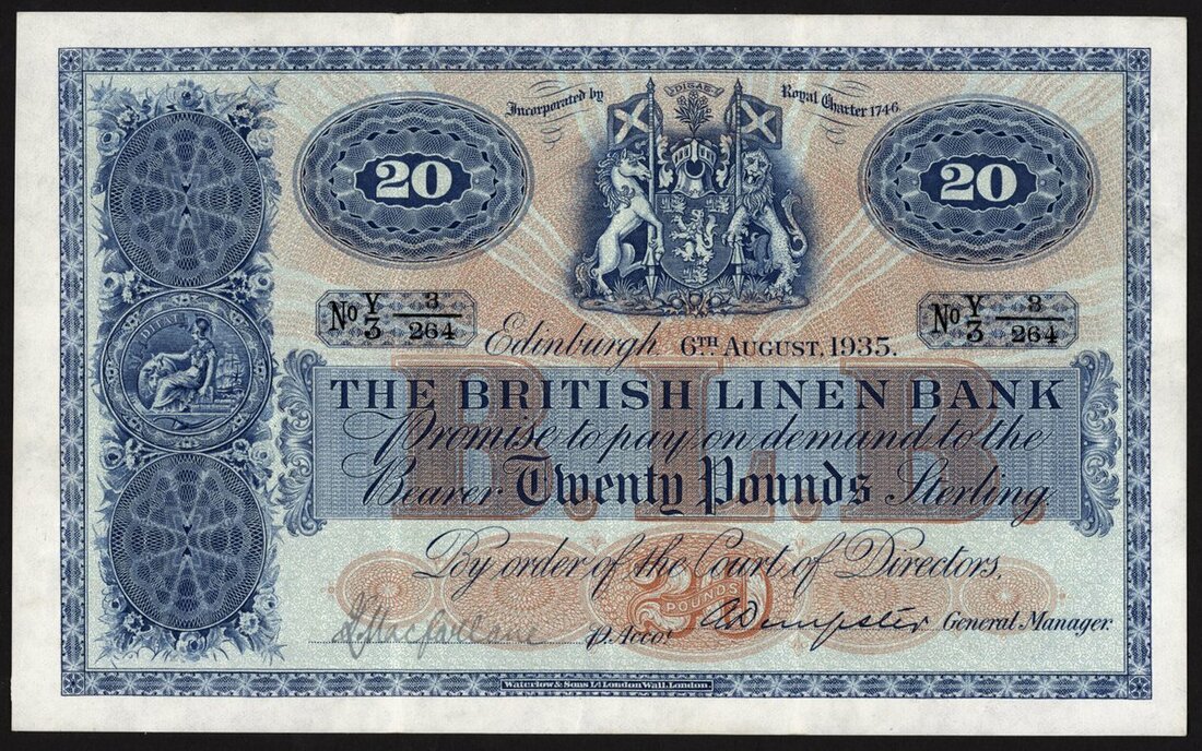 British Linen Bank, £20, 6 August 1935 serial number Y/3 3/264, (PMS BL68a), first date of issue, two usual creases, extremely fine. One of the best example seen for this type, very scarce