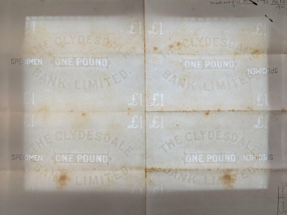 Clydesdale Bank Limited, a sheet of watermark paper with four £1, ca. (1921), with four SPECIMEN perforations, with maker's annotations, foxing, on thick deckle paper, very fine, interesting