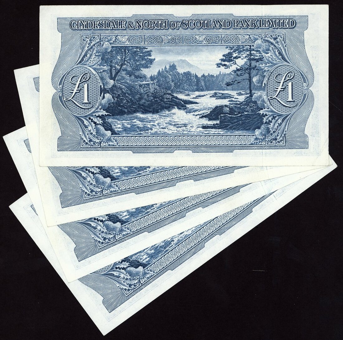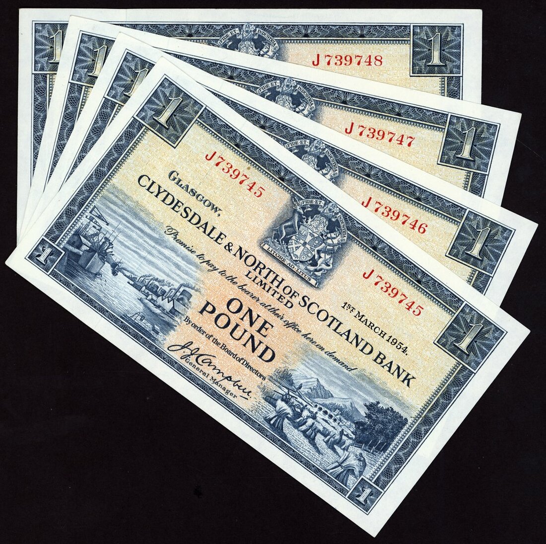 Clydesdale & North of Scotland Bank Limited, consecutive £1 (4), 1 March 1954, prefix J (PMS CL24a), with handling, good extremely fine (4 notes)