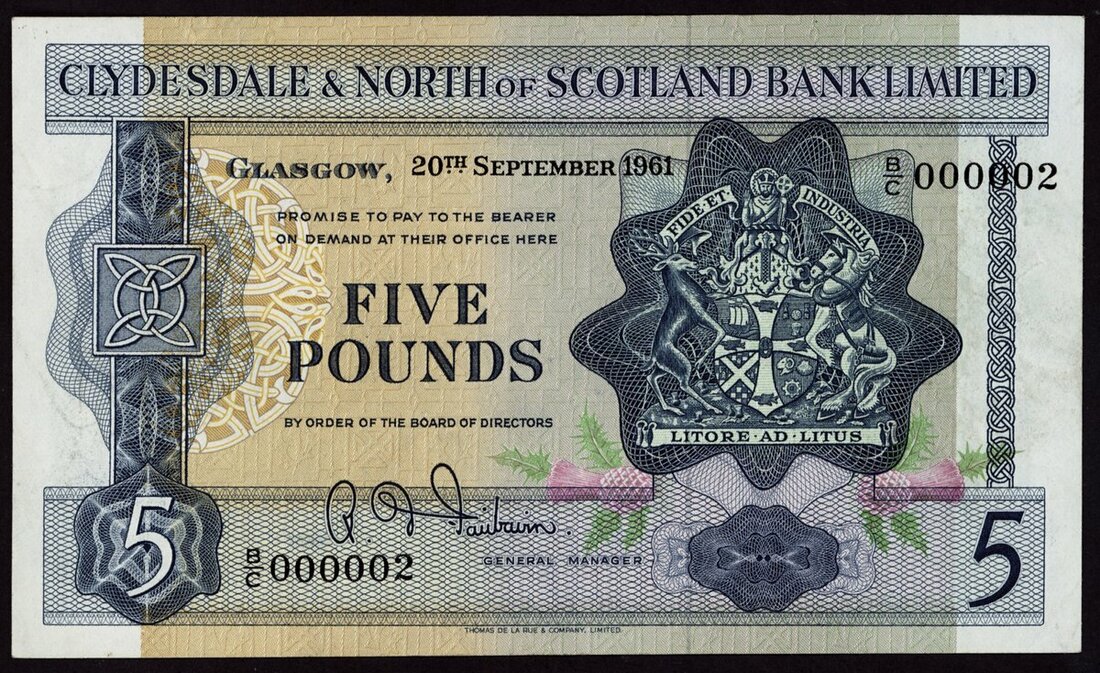 Clydesdale & North of Scotland Bank Limited, £5, 20 September 1961, serial number B/C 000002, (PMS CL29), very fine, mid prefix number 2 note!