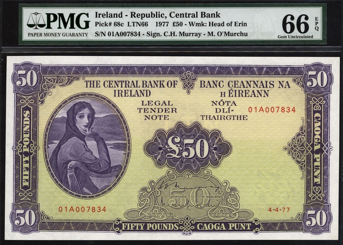 Central Bank of Ireland, ERROR £50, 1977, serial number 01A007834, purple on light yellow and green underprint, portrait Lady Lavery at left, value in each corner and at centre, ornate border, reverse, River God,