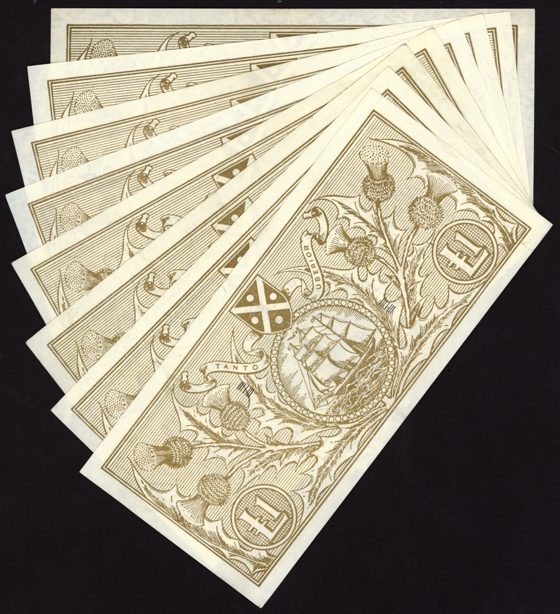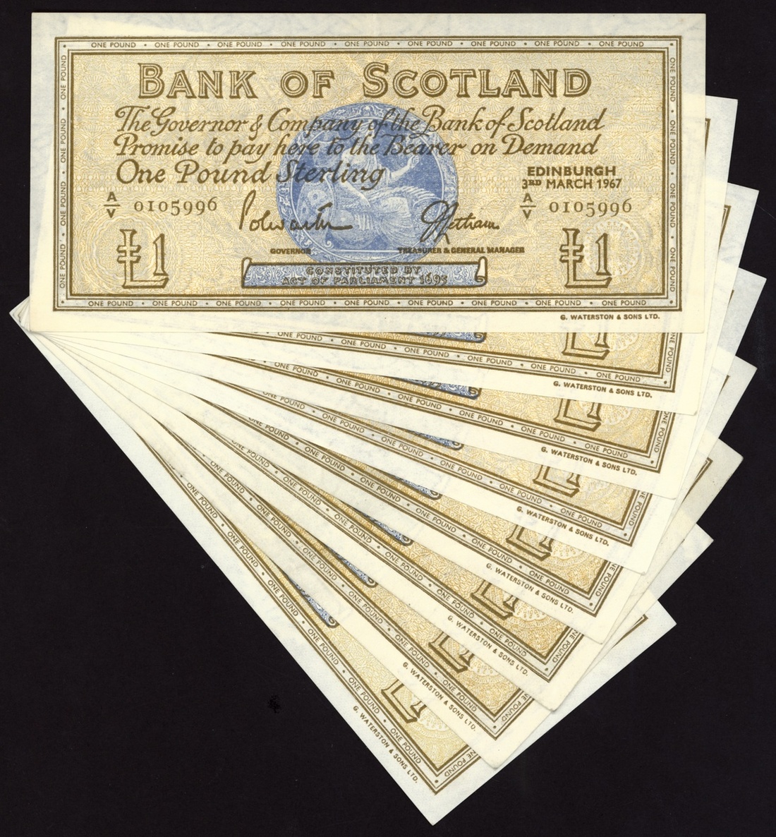 Bank of Scotland, £1 (8), 1967, prefixes A/V, A/W, A/X, A/Y, A/Z, B/A, B/B, B/C, (PMS BA100f, g), complete prefix of the 1967 issue, extremely fine or better (8 notes)