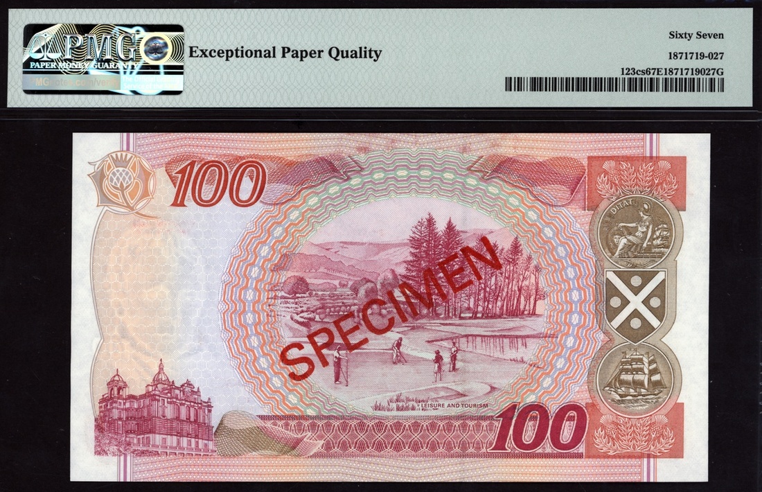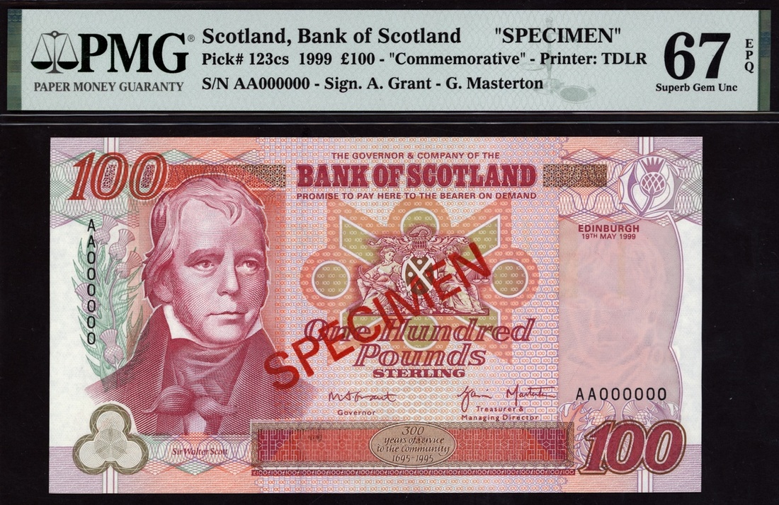 Bank of Scotland, specimen £100, 19 May 1999, zero serial numbers, (PMS BA126s, Pick 123cs), in PMG holder 67 EPQ Superb Gem Unc, scarce date