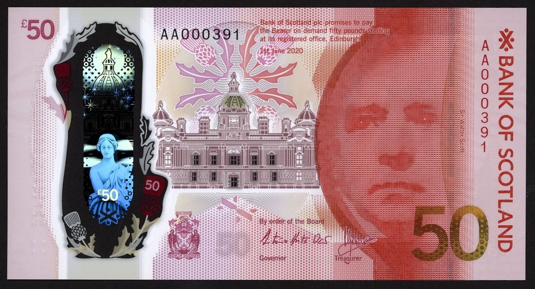 Bank of Scotland, polymer £50, 2020, serial number AA 000391, (PMS BA137), uncirculated