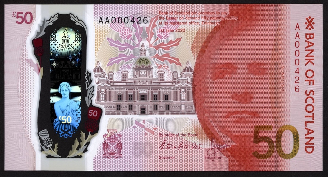 Bank of Scotland, polymer £50, 2020, serial number AA 000426, (PMS BA137), uncirculated