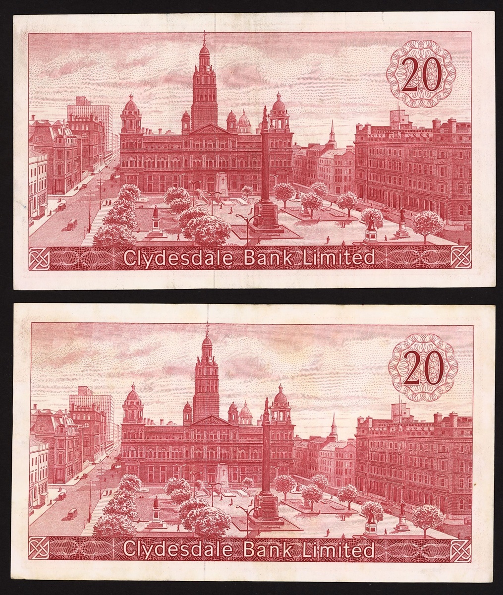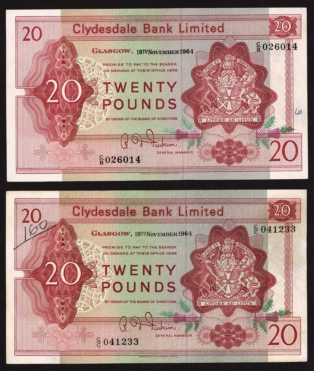 Clydesdale Bank Limited, £20 (2), 19 November 1964, prefixes C/B, C/C (PMS CL33), good very fine, C/C with pen annotation