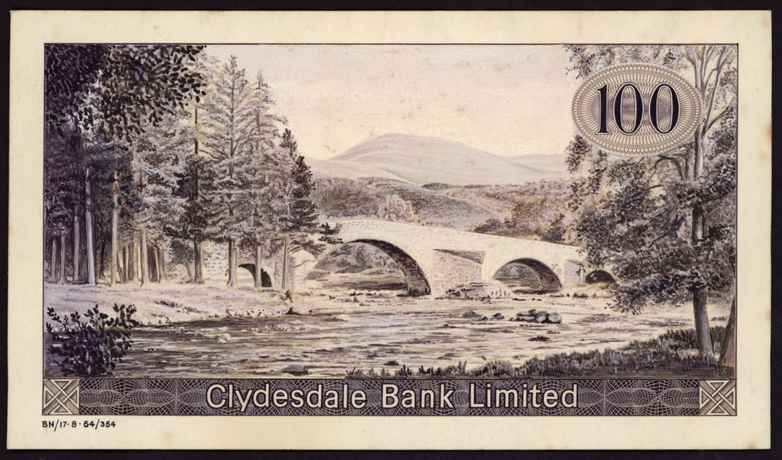 Clydesdale Bank Limited, reverse composite essay for a £100, 1964, dark purple, River Dee and Invercauld Bridge at reverse,
