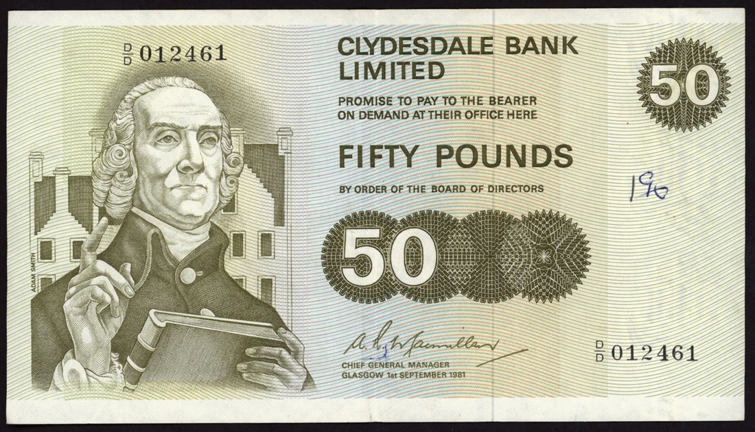 Clydesdale Bank Limited, £50, 1 September 1981, serial number D/D 012461, (PMS CL39), centre crease, pen annotation at right, extremely fine