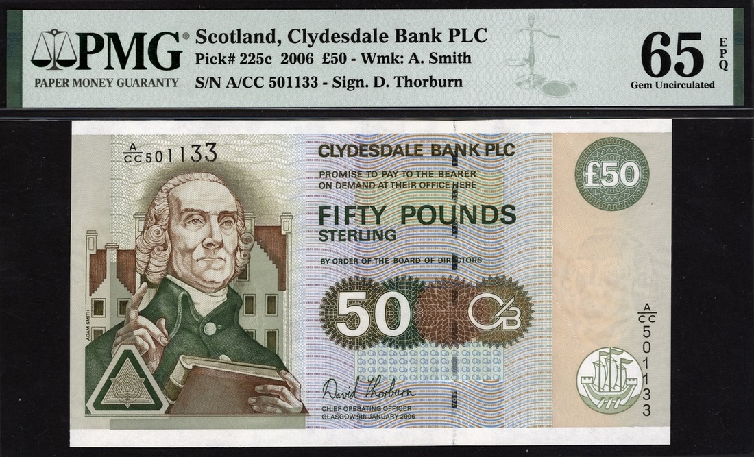 Clydesdale Bank Plc, £50, 9 January 2006, serial number A/CC 501133, (PMS CL62d, Pick 225c), series starts from 500001, hence low number, in PMG holder 65 EPQ Gem Uncirculated