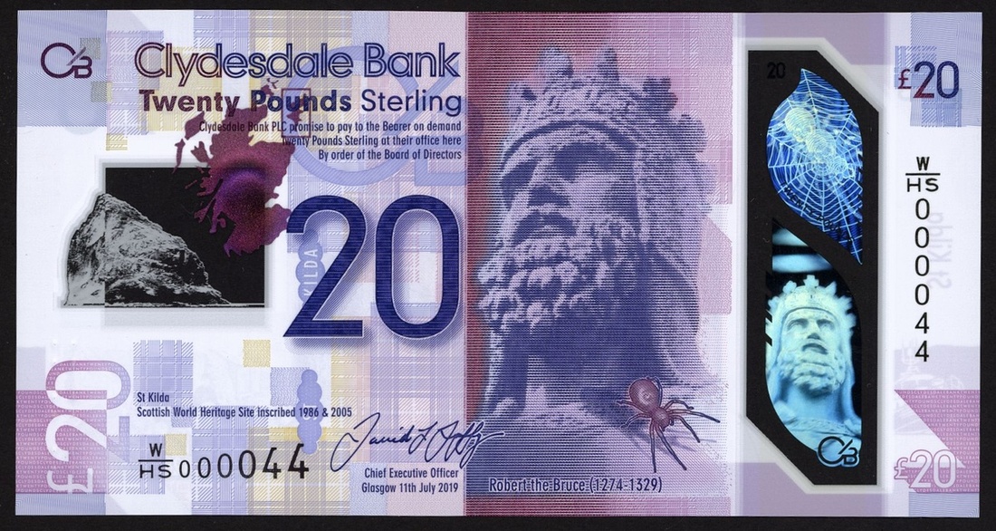 Clydesdale Bank, polymer £20, 2019, serial number W/HS 000044, (PMS CL72), The highest denomination of the Clydesdale polymer series, first prefix very low number, uncirculated