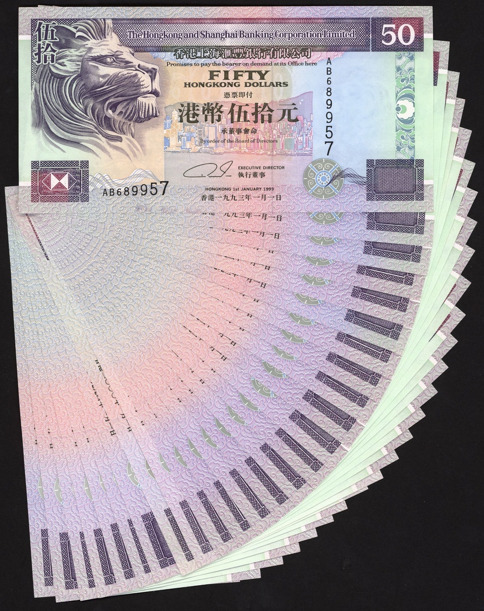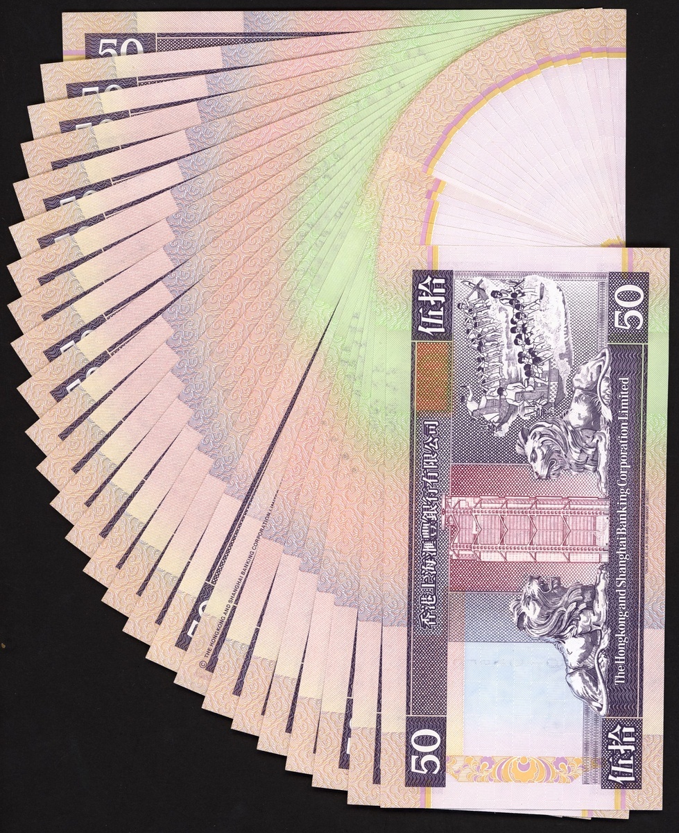 (x) HongKong and Shanghai Banking Corporation, $50 (27), 19993-4, prefix AB, AL, AZ, BP, CF, CL, (Pick 202), uncirculated (27 notes)