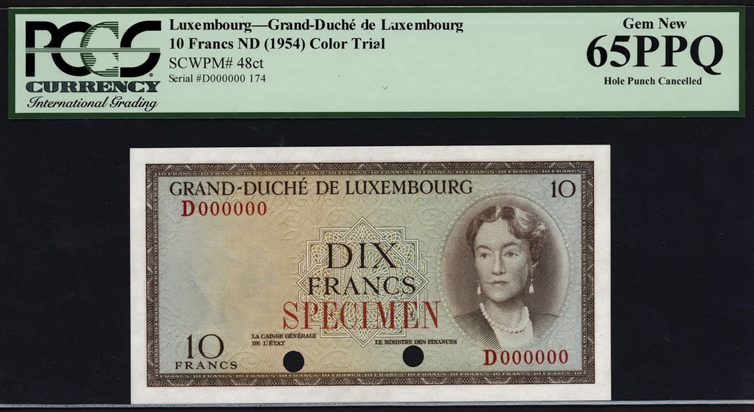 (x) Grand-Duche de Luxembourg, colour trial 10 francs, ND (1954), serial number D000000, (Pick 48ct, BNB B331bt), in PCGS holder, hole punch cancelled, 65 PPQ Gem New. Rarely seen without mounting traces at reverse, the single highest grade example known