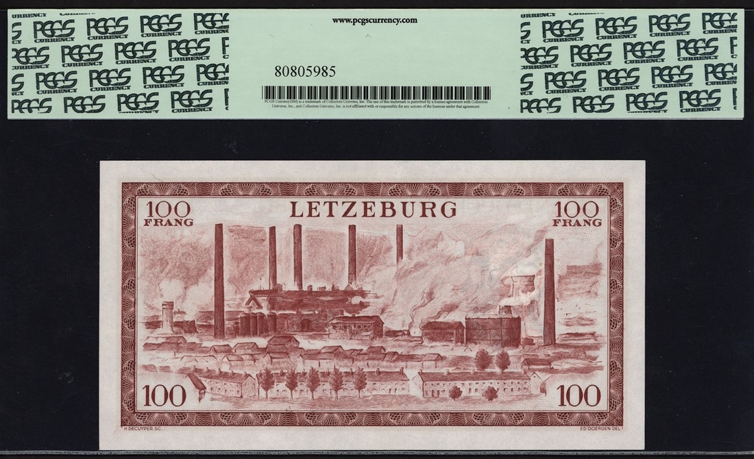 (x) Grand-Duche de Luxembourg, 100 francs, 1956, serial number A650957, (Pick 50a), first prefix, in PCGS holder 63 Choice New