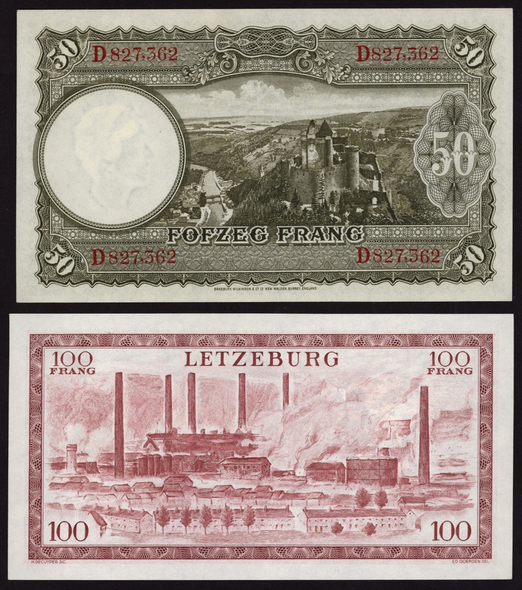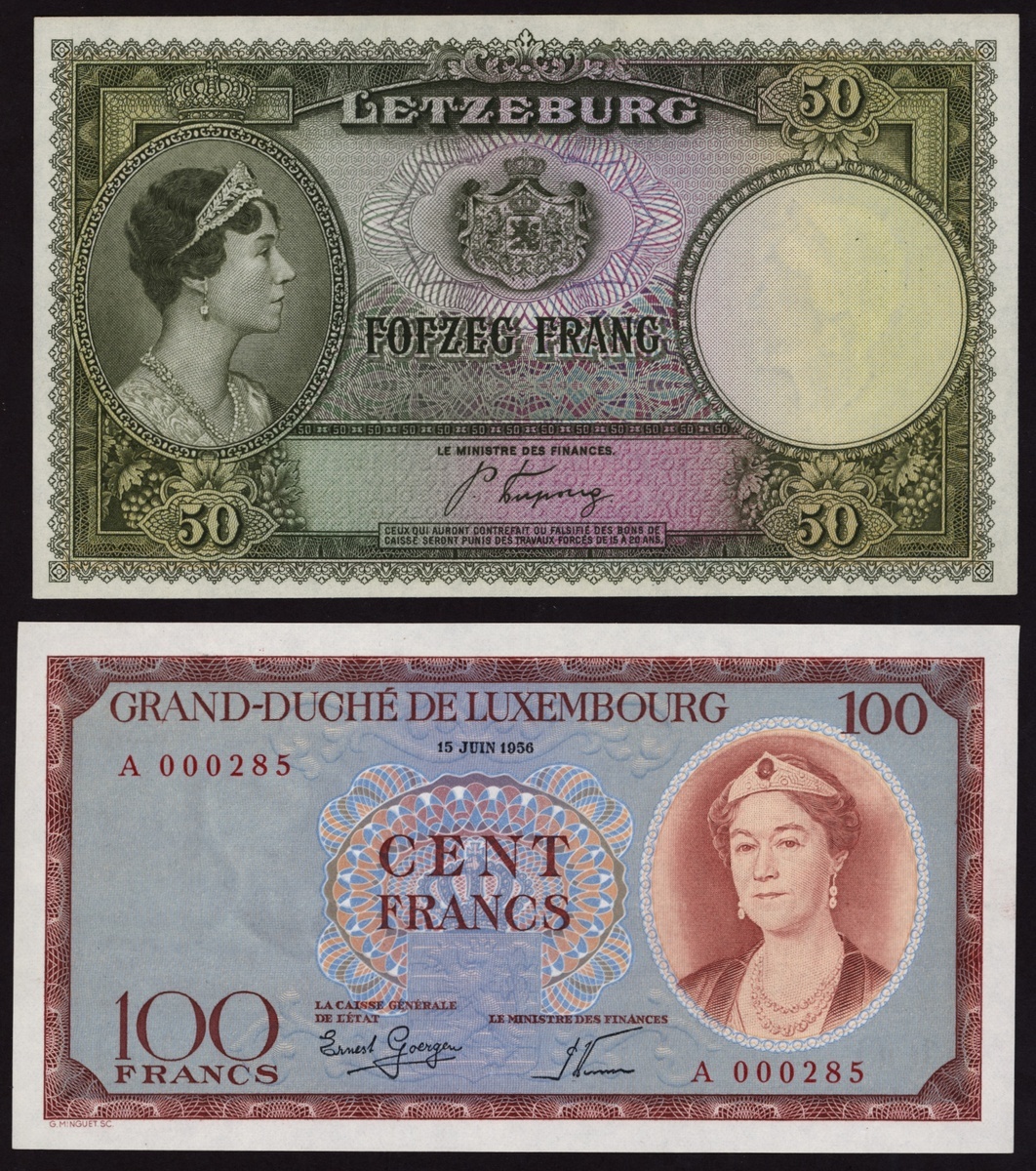 Grand-Duche de Luxembourg, 100 francs, 1956, serial number A000285, also a 50 frang, ND (1944), prefix D,