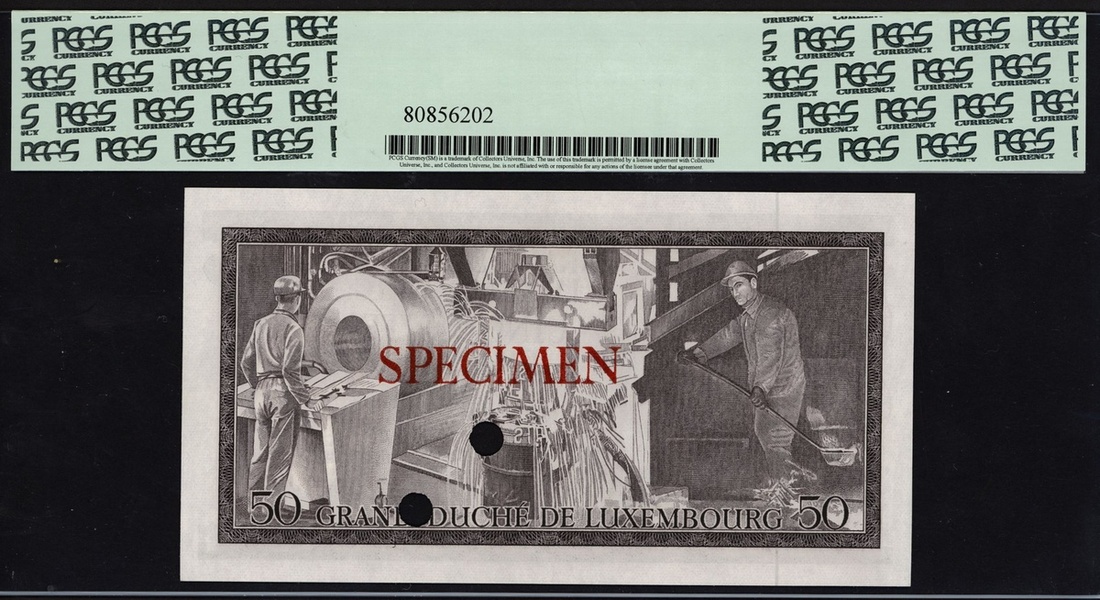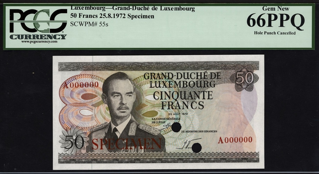 (x) Grand-Duche de Luxembourg, specimen 50 francs, 1972, serial number A000000, (Pick 55s), in PCGS holder, hole punched cancelled, 66 PPQ Gem New