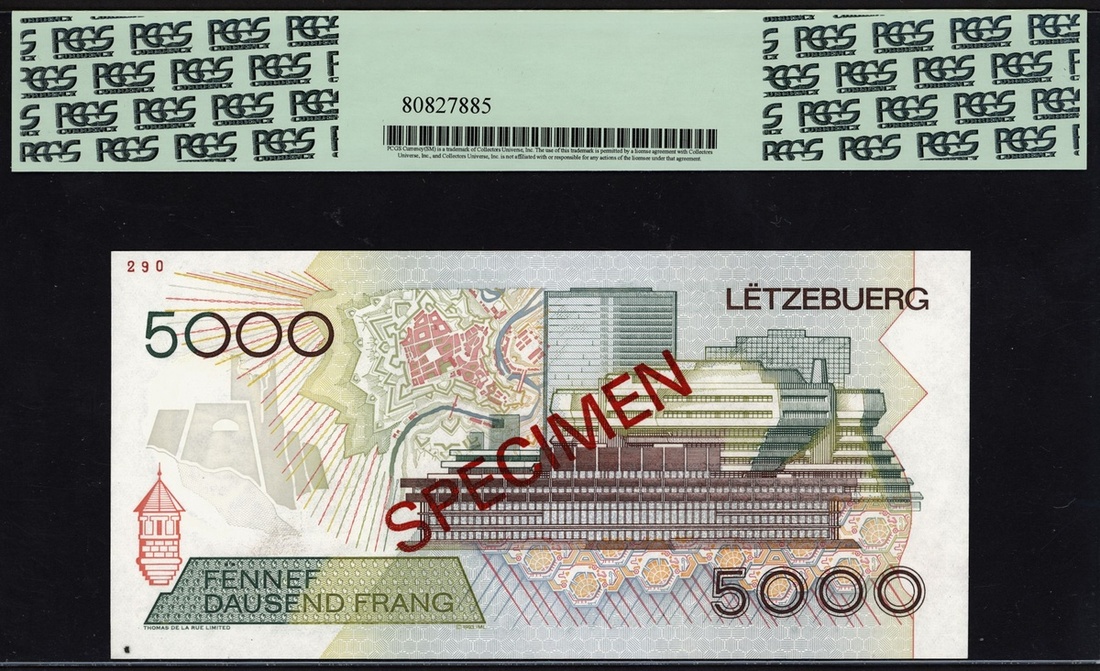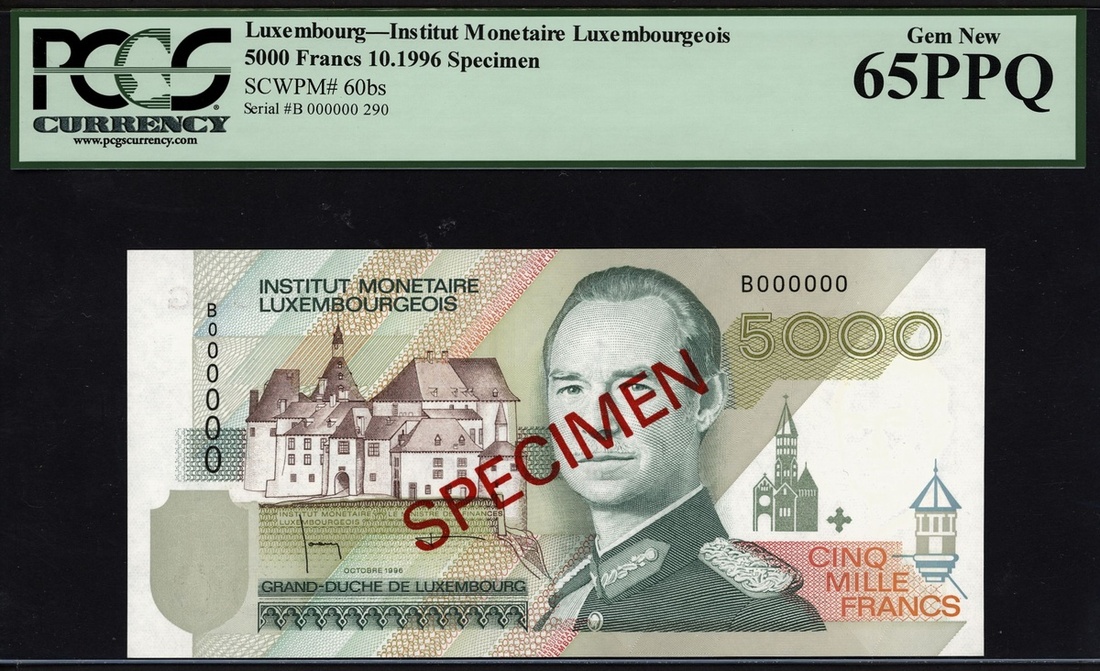 (x) Institut Monetaire Luxembourgeois, specimen 5000 francs, 1996, serial number B000000, (Pick 60s, BNB B403s), in PCGS holder 65 PPQ Gem New. The highest denomination note from the last issue of Luxembourg francs before the Euro. High grade example