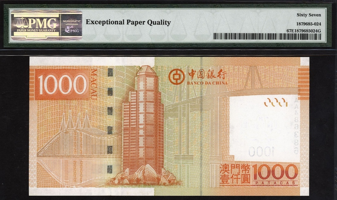 (x) Banco da China, Macau, 1000 patacas, 2017, serial number AA486386, (Pick 113, BNB B218), in PMG holder 67 EPQ Superb Gem Unc