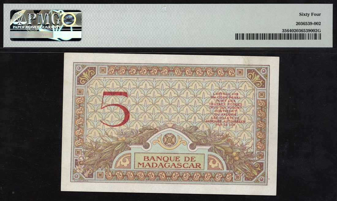 (x) Banque de Madagascar, 5 francs, ND (1937), serial number E.2523140, (Pick 35), in PMG holder 64 Choice Uncirculated