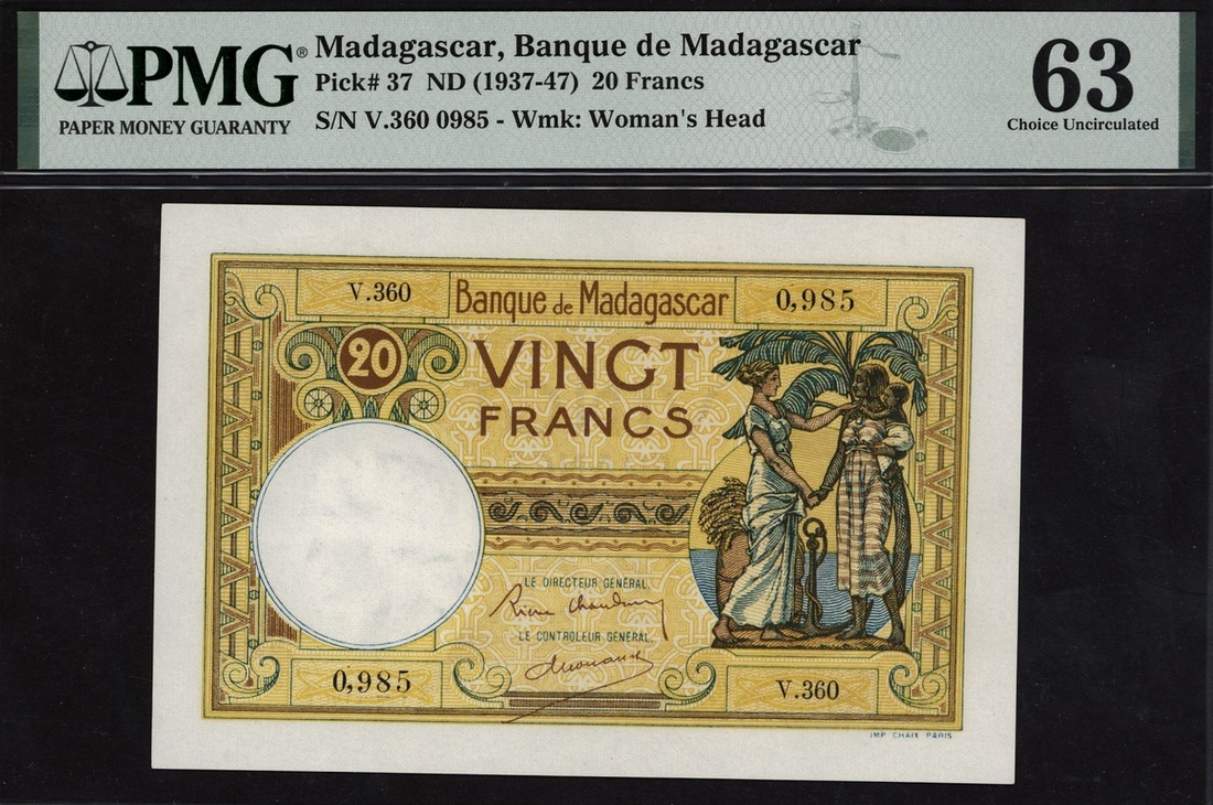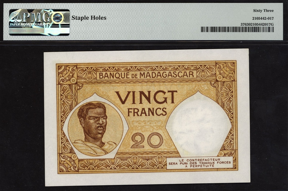 (x) Banque de Madagascar, 20 francs, ND (1937-47), serial number V.360 0985, (Pick 37), in PMG holder, staple holes, 63 Choice Uncirculated