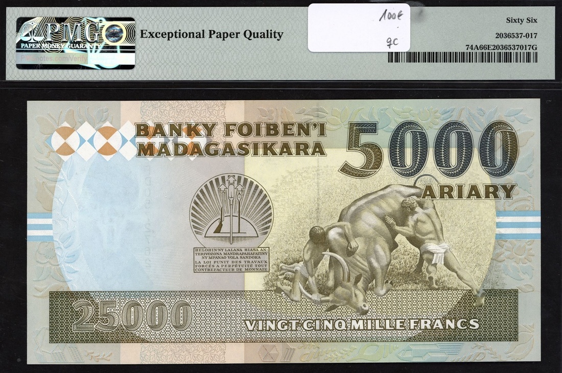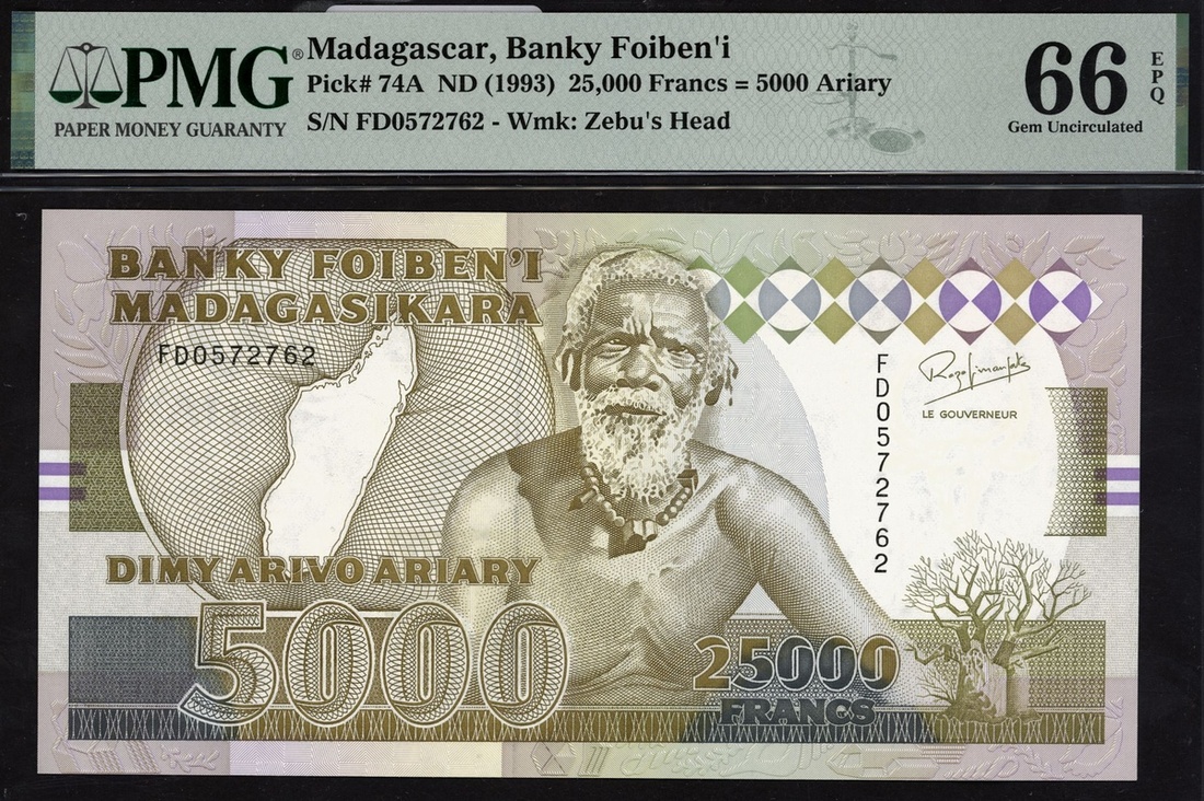 (x) Central Bank of Madagascar, 25,000 francs, ND (1993), serial number FD0572762, (Pick 74A), in PMG holder 66 EPQ Gem Uncirculated