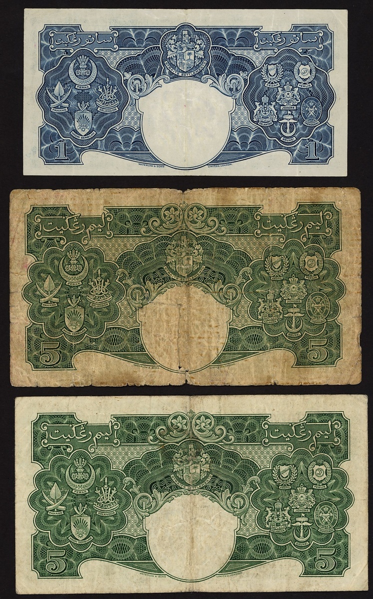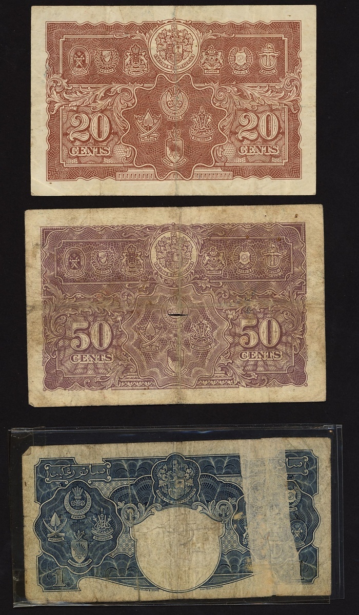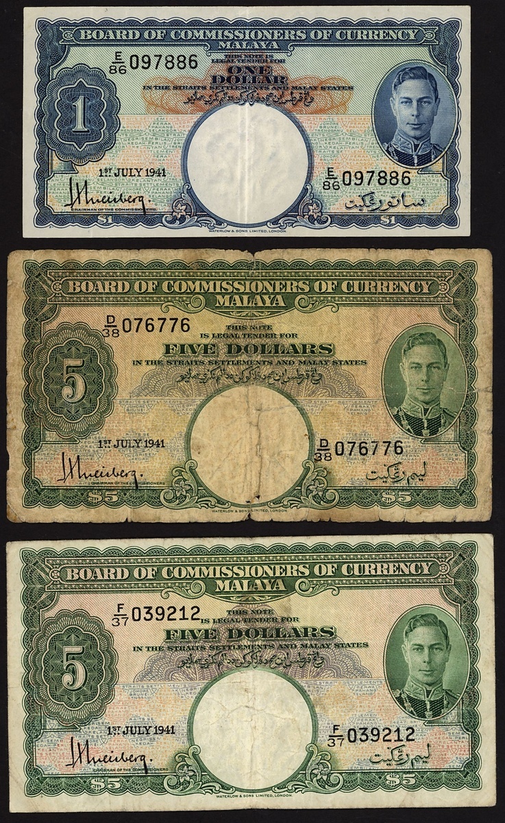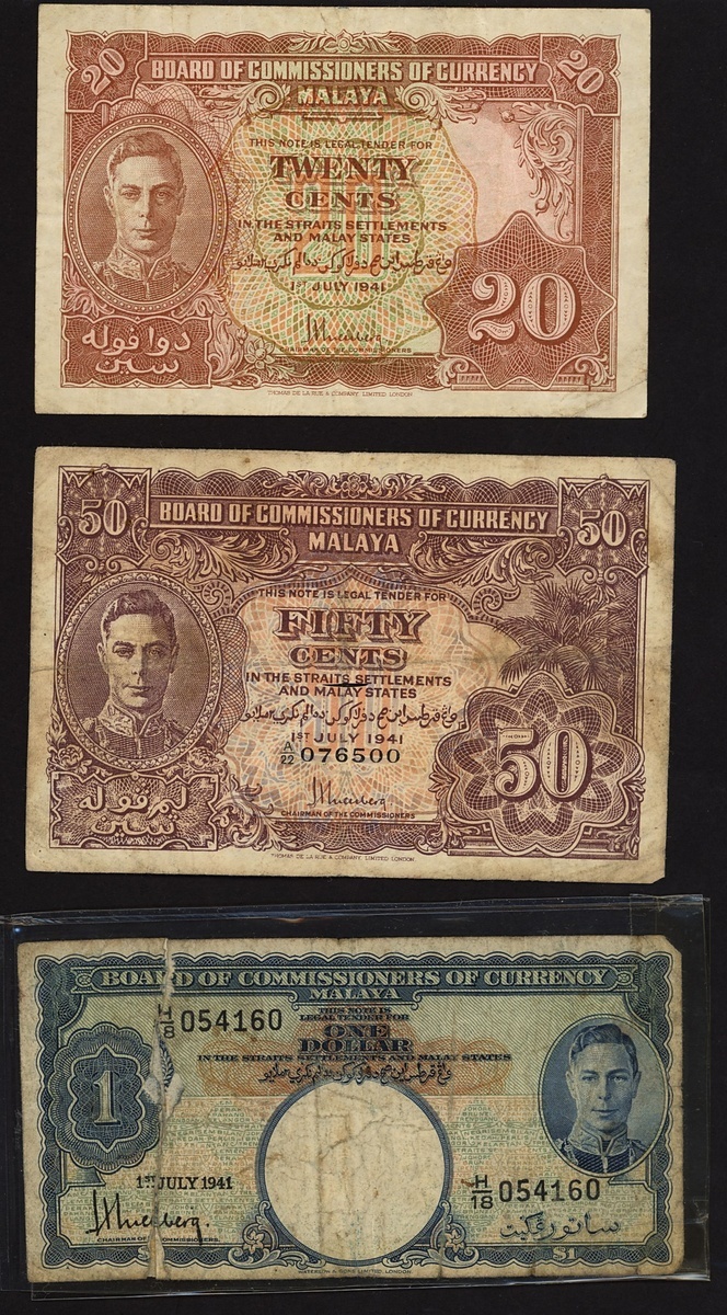 Board of Commissioners of Currency, Malaya, a group of 1941 issues, including 20, 50 cents, $1 (2), $5 (2), $20,