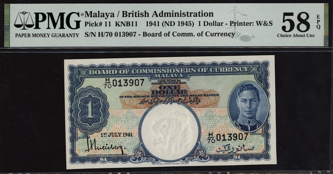 Malaya, 1 dollar, 1941 (ND 1945), serial number H/70 013907, (Pick 11), in PMG holder 58 EPQ Choice About Uncirculated