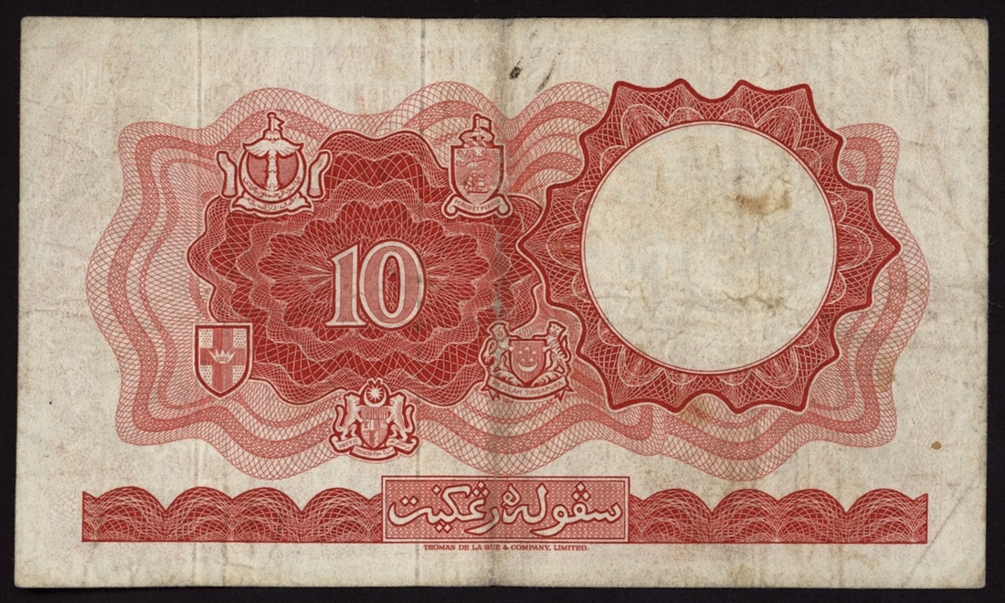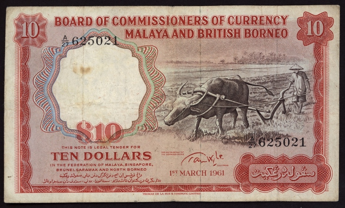 Board of Commissioners of Currency, Malaya and British Borneo, 10 dollar, 1 March 1961, serial number A/27 025021, (Pick 9a, BNB B109a), fine