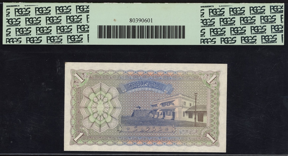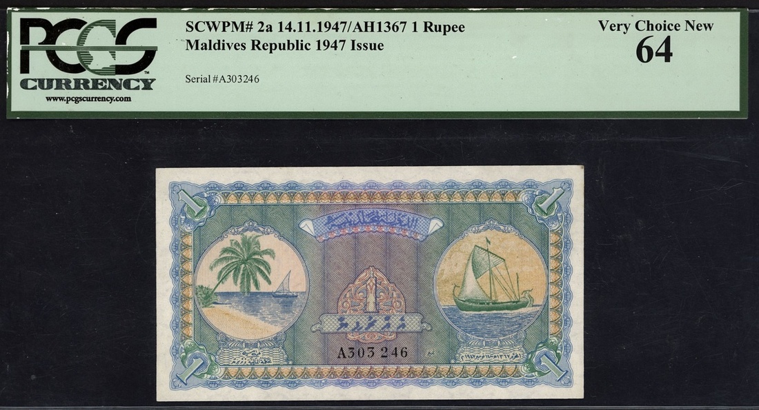 (x) Maldives, 1 rupee, 1947 serial number A303246, (Pick 2a), in PCGS holder 64 Very Choice New