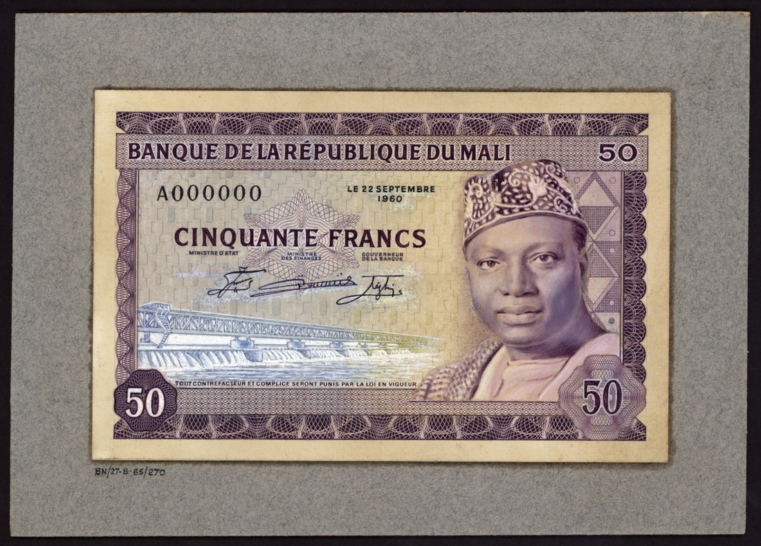 Banque de la Republique du Mali, obverse composite essay for 50 francs, 22 September 1960, serial number A000000, purple, Markala dam at left, President Modibo Keita at right,
